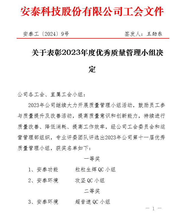 為鼓勵員工參與質量提升及改善活動,提高質量意識和創新能力,持續進行質量改善、降低消耗、提高工作效率,河冶科技-質管部超聲探傷QC小組榮獲中央企業、北京市優秀質量管理小組三等獎, 2023年安泰科技第十一屆優秀質量管理小組二等獎。
