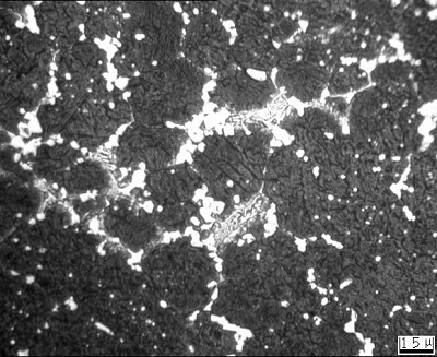 過 燒  在金相組織中晶界上出現萊氏體共晶組織,并呈塊狀或半網狀分布(圖2),還有可能出現黑色組織。